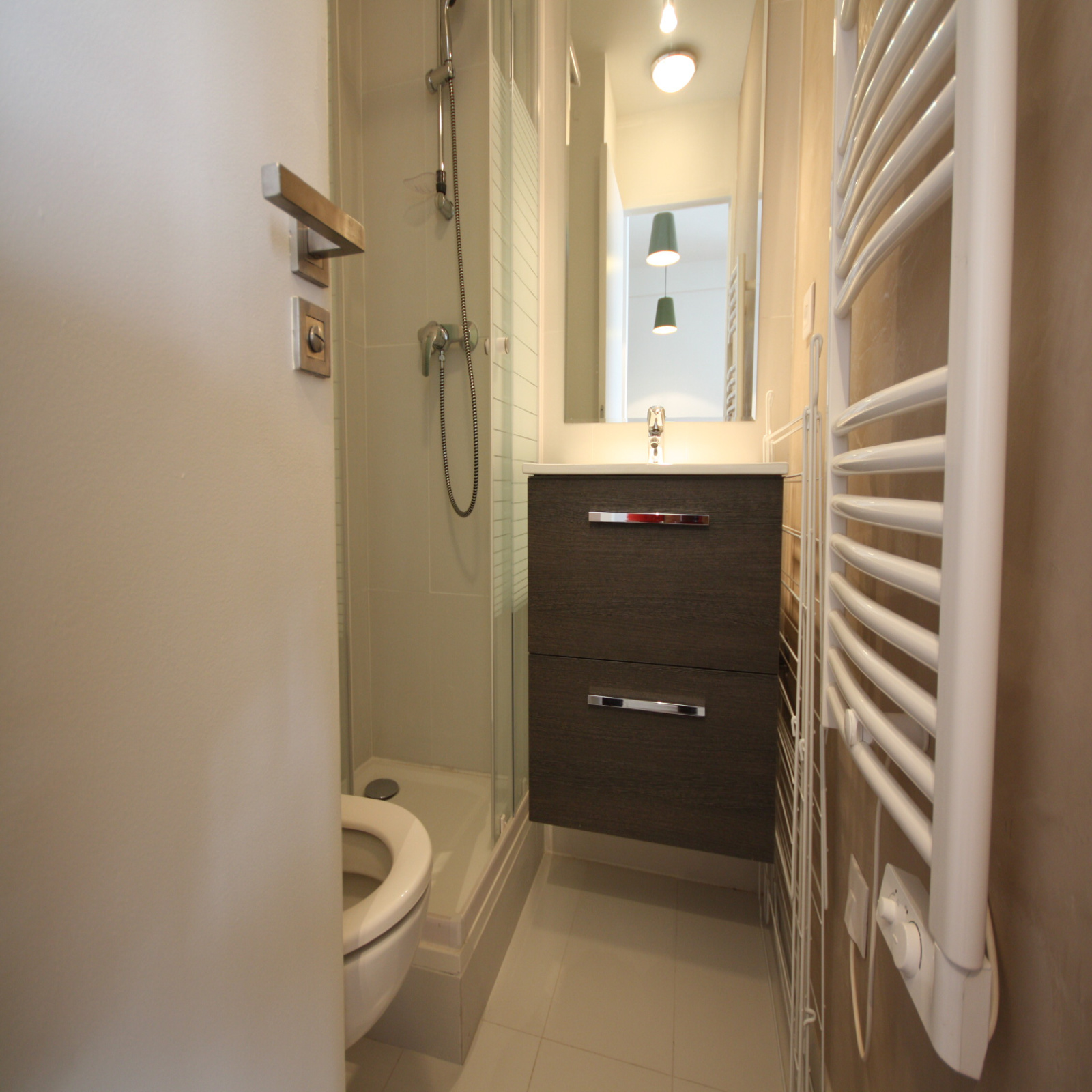 La salle d'eau est équipée d'une douche italienne, de WC ainsi qu'un seche-serviette et de rangements alliant fonctionnalité et design, avec des finitions modernes qui sauront vous plaire.