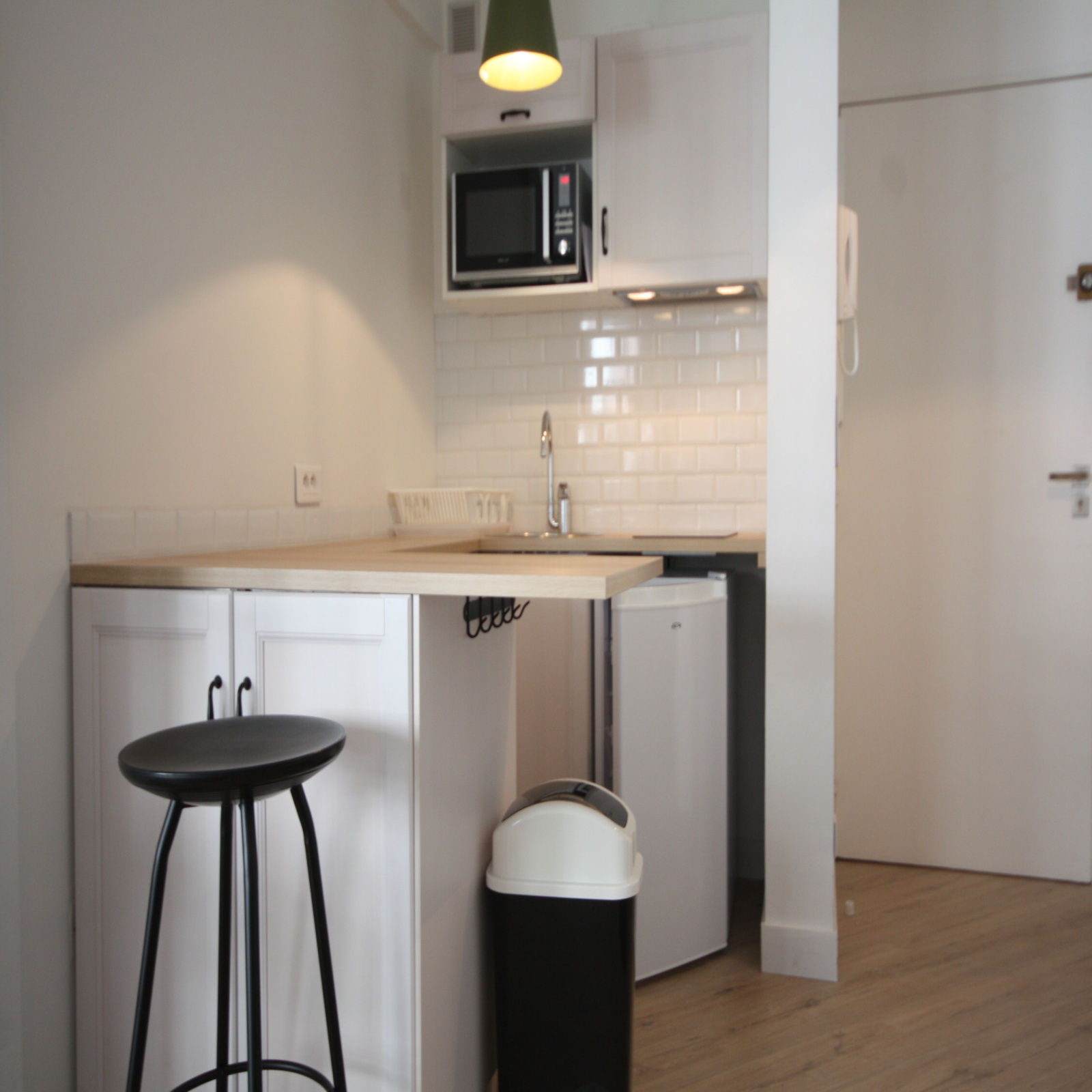 ce logement est dotés d'une cuisine modern entièrement équipée avec frigo, micro-onde, plan de travail ainsi que de nombreux rangements.